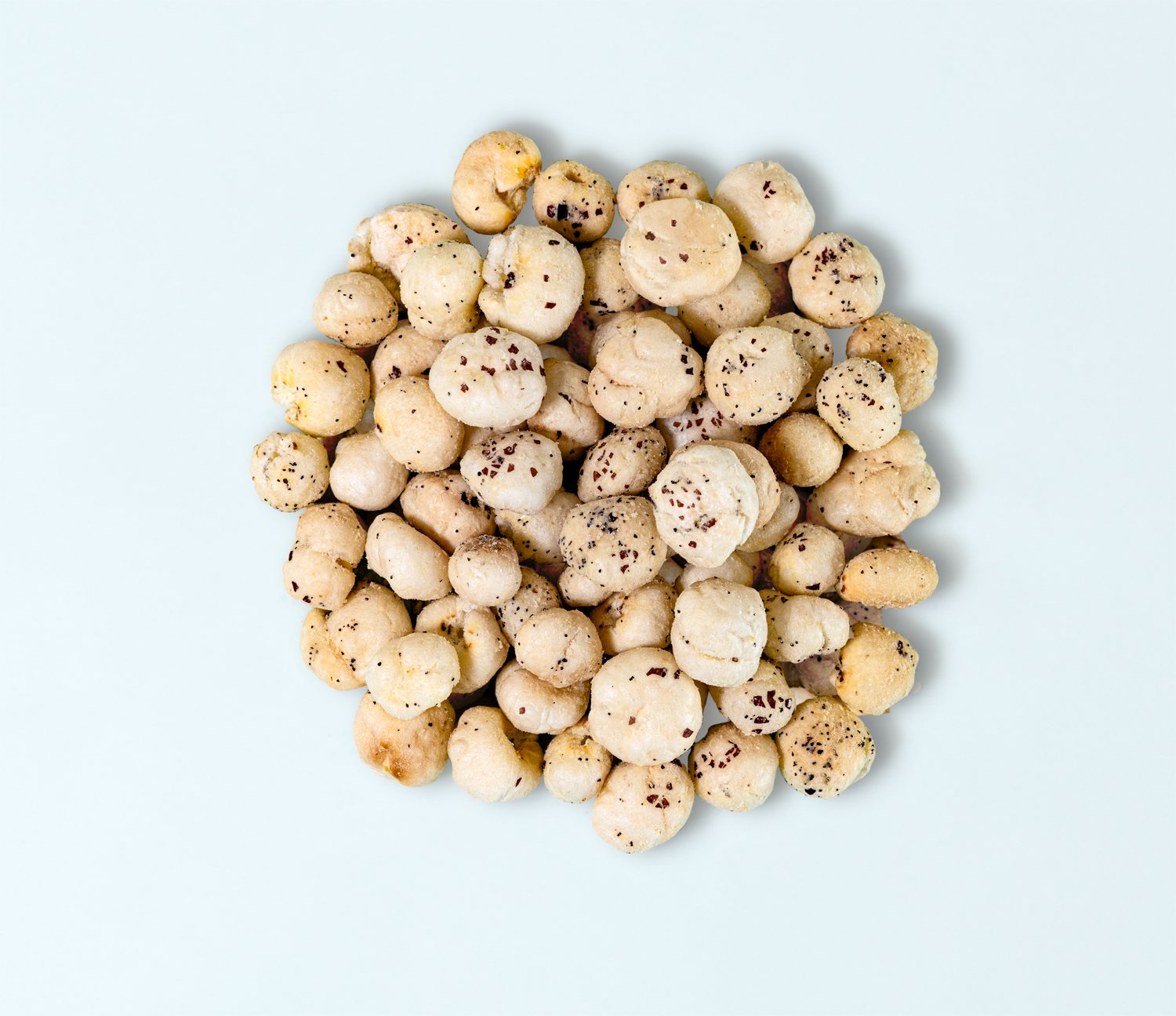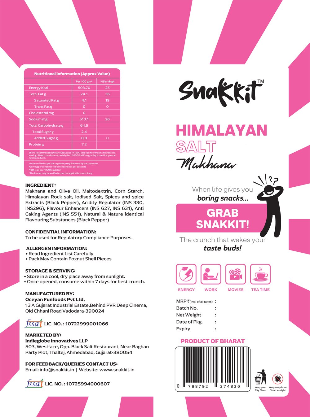 Makhana and Olive Oil, Maltodextrin, Corn Starch, Himalayan Rock salt, Iodised Salt, Spices and spice Extracts (Black Pepper), Acidity Regulator (INS 330, INS296), Flavour Enhancers (INS 627, INS 631), Anti Caking Agents (INS 551), Natural & Nature identical Flavouring Substances (Black Pepper)